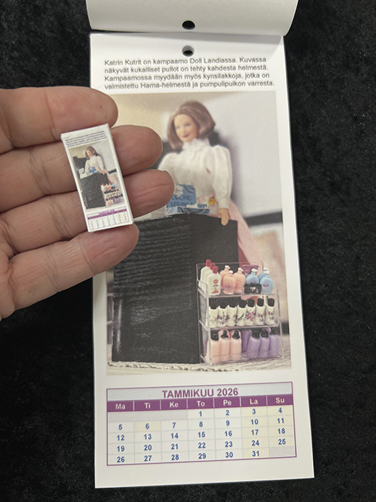 Ihan uudenlainen kalenteri näki tänään päivänvalon. Siinä on kuukausien kohdalla kuvia Doll Landiasta ja pieniä tekstinpätkiä, jotka sisältävät askarteluideoita ja nukkevalokuvausvinkkejä. Kalenterin lopussa on yli 20 esineen printit. Niistä voi askarrella esineitä omaan nukkekotiin - osa käy moneen mittakaavaan, osasta löytyy 1:12 ja 1:6...
